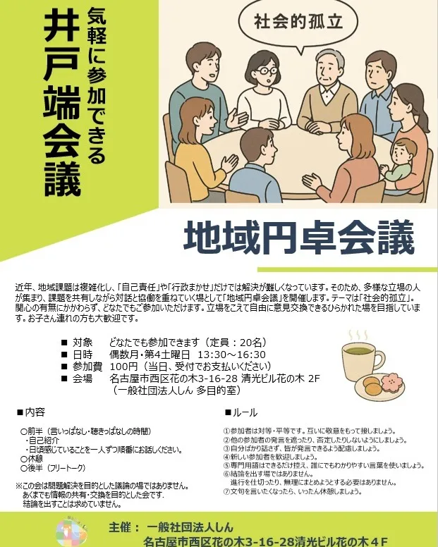 そこで地域円卓会議では、多様な組織や人が、お互いの力や課題を共有しつつ、対話を積み重ねる場を設ける取り組みをしています。高齢者、障害者、育児ママ、子ども、ニート、引きこもり、外国人、LGBTQ+など 「社会的孤立」がテーマです。現在、活動をしている方だけでなく、関心がある人もない人もお気軽にお越しください。